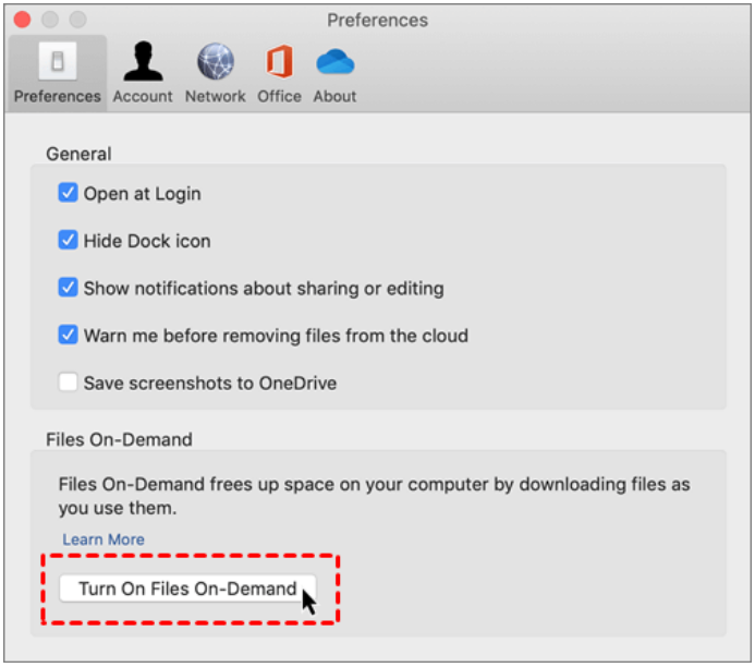 Step 3. In the Settings tab, tick the box next to Save space and download files as you use them. Or click on Turn on Files On-Demand on your Mac directly.