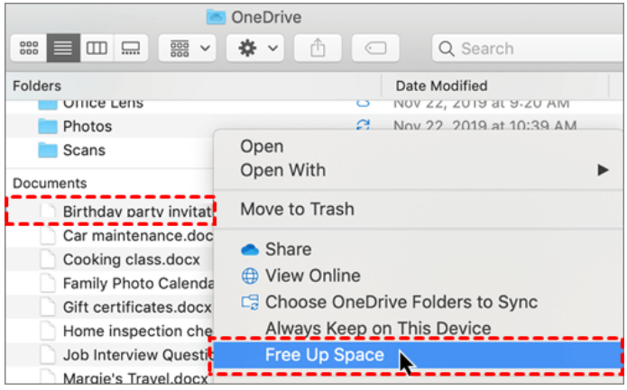 Step 4. Open the OneDrive folder in Windows Explorer. To mark a file or folder as online-only (with a blue cloud icon), you can hit the Free up space option.
